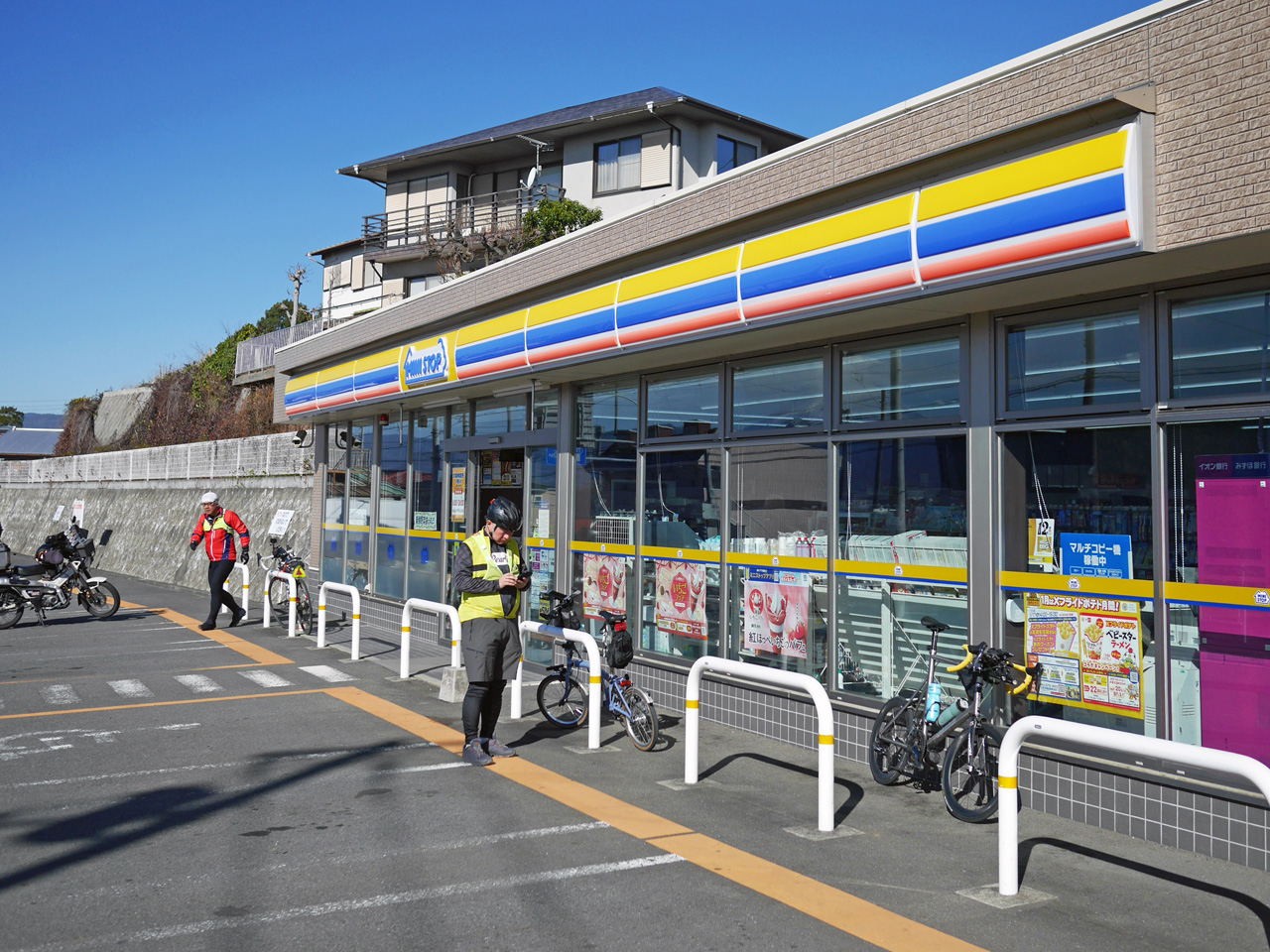 こうして11:30頃、CP1のミニストップ小田原曽我原店に到着。先行してたくれよんレンジャーさんと合流を果たします。レシートを取得するためにミネラルウォーターとおにぎりを購入。駐車場脇で非人権飯をパクついてると、西から突風が吹き付けて停車中のオートバイが横転。荒れてきたなあ。