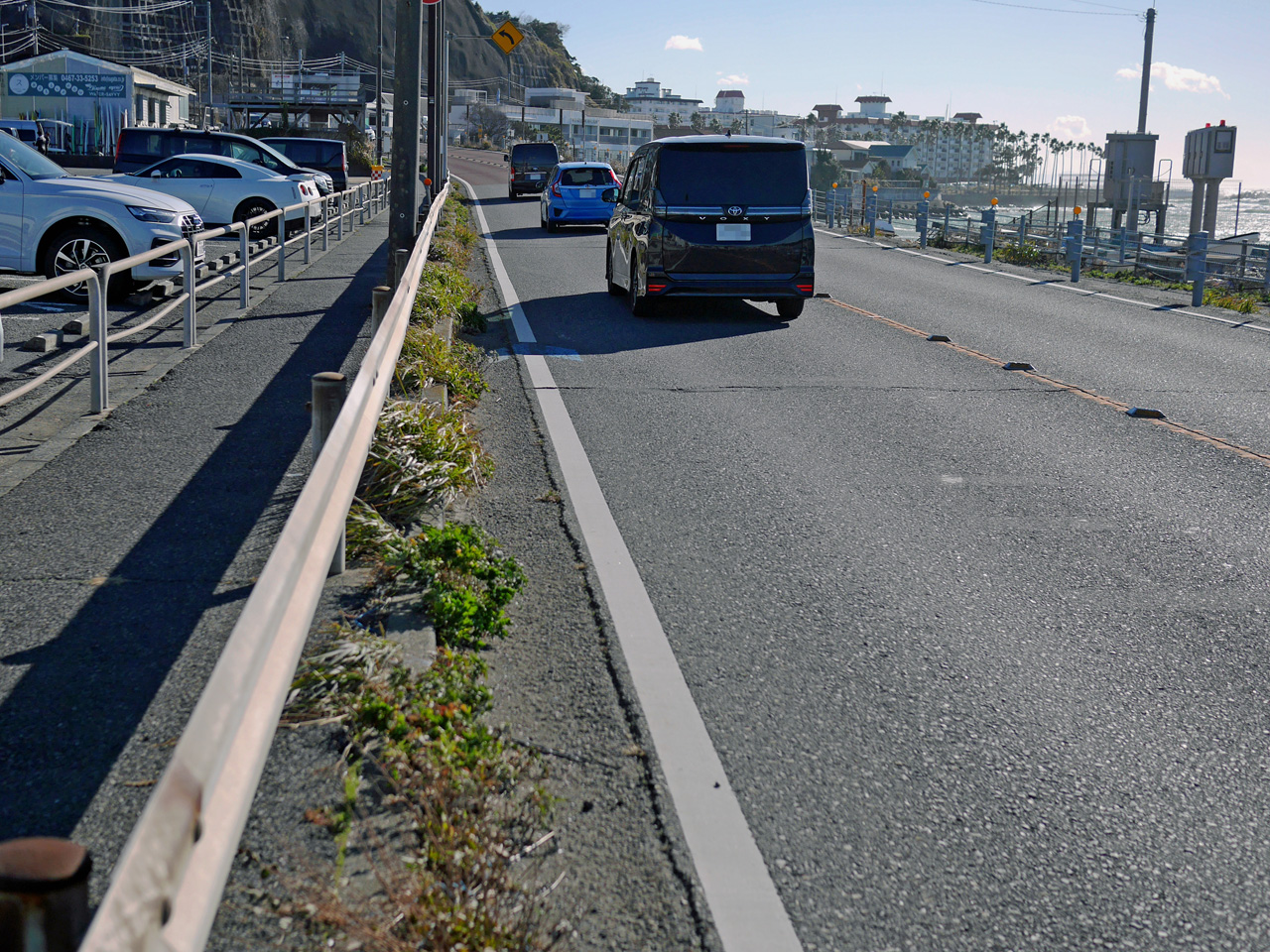 こうして稲村ヶ崎を抜け、由比ヶ浜を抜け、材木座海岸へ。ようやく渋滞がなくなり車速を上げられるぞとペダルを踏み込んだ瞬間、右からの突風に煽られてガードレールに激突。怪我はなかったものの、左ブラケットが内側に曲がりました。もう無理ぽ。